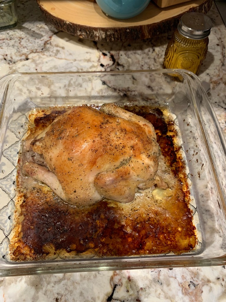 I preheated the oven to 350. Next, I melted a generous amount of butter in a roasted pan, and brushed it over the chicken. I continued to brush melted butter over the chicken every thirty minutes while it cooked – which was a little over an hour. I cooked it until It was browned, and about 165 degrees in the center. Nice and simple! And it remained tender and moist, which is a pretty big accomplishment for me when it comes to chicken!