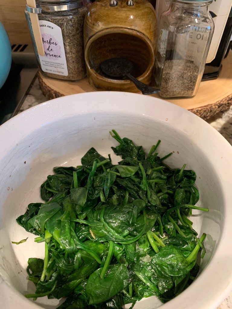 For the sides I sauteed spinach with olive oil, and salt and pepper; as well as squash and onions with an oil blend (pictured below), salt and pepper, and whole garlic cloves! Both dishes, I sauteed until the vegetables were nice and soft!
